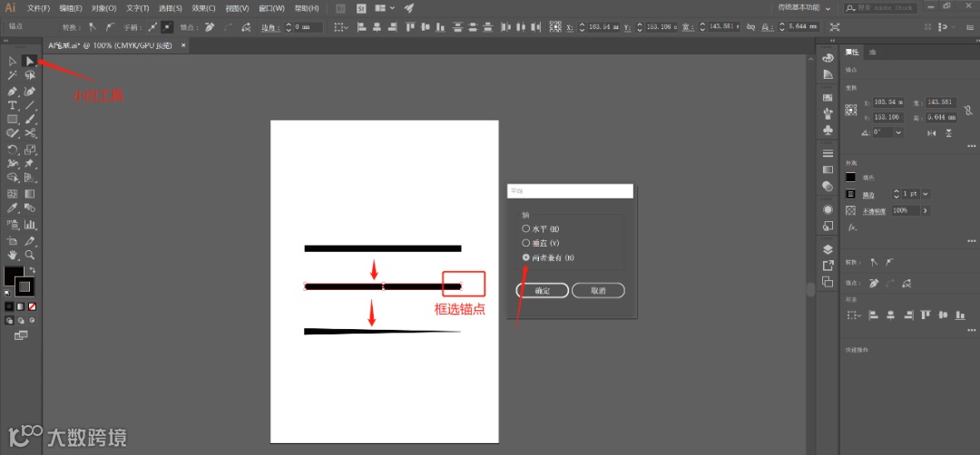 2、用小白工具(白色箭头)框选顶端的两个锚点,按住CTRL+ALT+J(连接两个锚点),这时会弹出一个弹窗,选中两者兼有,点击确定,让矩形从4个锚点变成3个锚点。