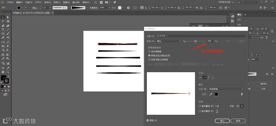 最后补充一下,勾线的时候如果觉得粗细不合适的话,可以双击做好的笔刷,在艺术画笔选项弹窗中根据需求随意调整画笔粗细!