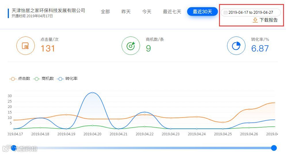流量宝于4月17日正式上线,根据后台检测,流量宝点击每天20次左右,几乎每天都能收到至少一天精准商机咨询,转化率达到了6.87%。