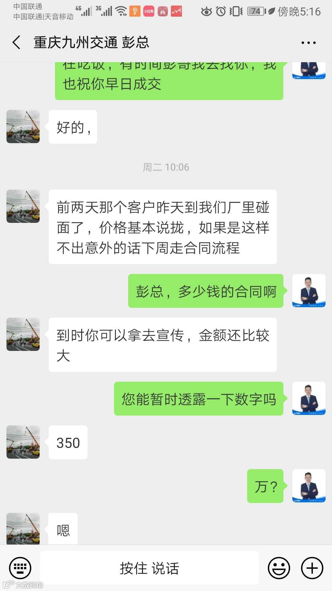 2019年4月16日,重庆九州交通设施有限公司的彭总,给我们的销售发来消息,谈妥一笔350万元的订单,合同马上签订。彭总说:“金额还比较大,你可以拿去宣传。”