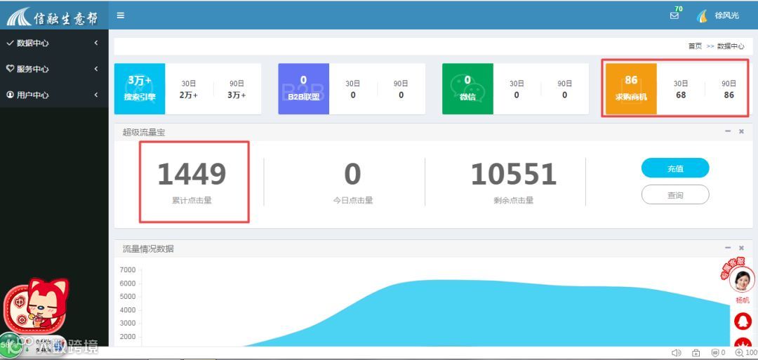 恒空吉星的徐总是在11月初跟信融科技合作了10000次流量宝,到目前为止,点击了1449次,就已经累积了86条精准商机。
