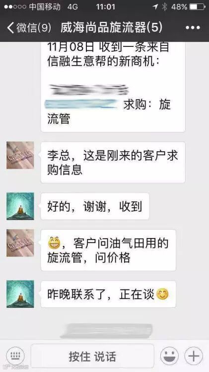 11月16日,正值信融集团月中冲刺的关键时刻,烟台信融的每个人都在为冲刺月中目标而努力着。下午的时候,烟台信融的崔总收到了一条信息:“崔总,流量宝的续费费用已经支付了,请查收。”信息来自于烟台信融的老客户,威海尚品机械设备科技有限公司。