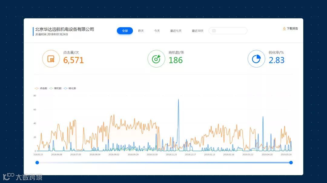 18年7月份合作客户,点击到现在已经累计6000多次。转化2.83%。近200条商机跟进。令同行羡慕不已。