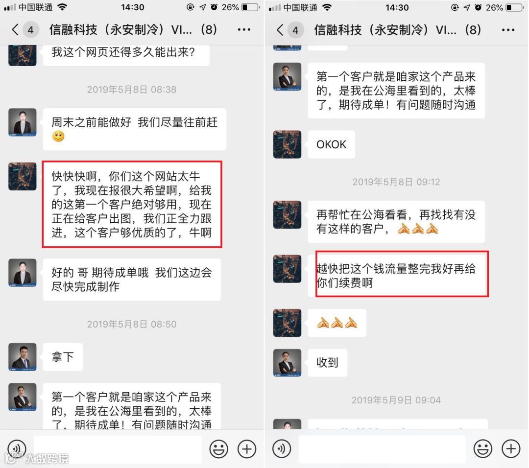 这是哈尔滨市永安制冷有限公司王总在尝试了流量宝后给予的高度评价,并立刻要求与我们续费。