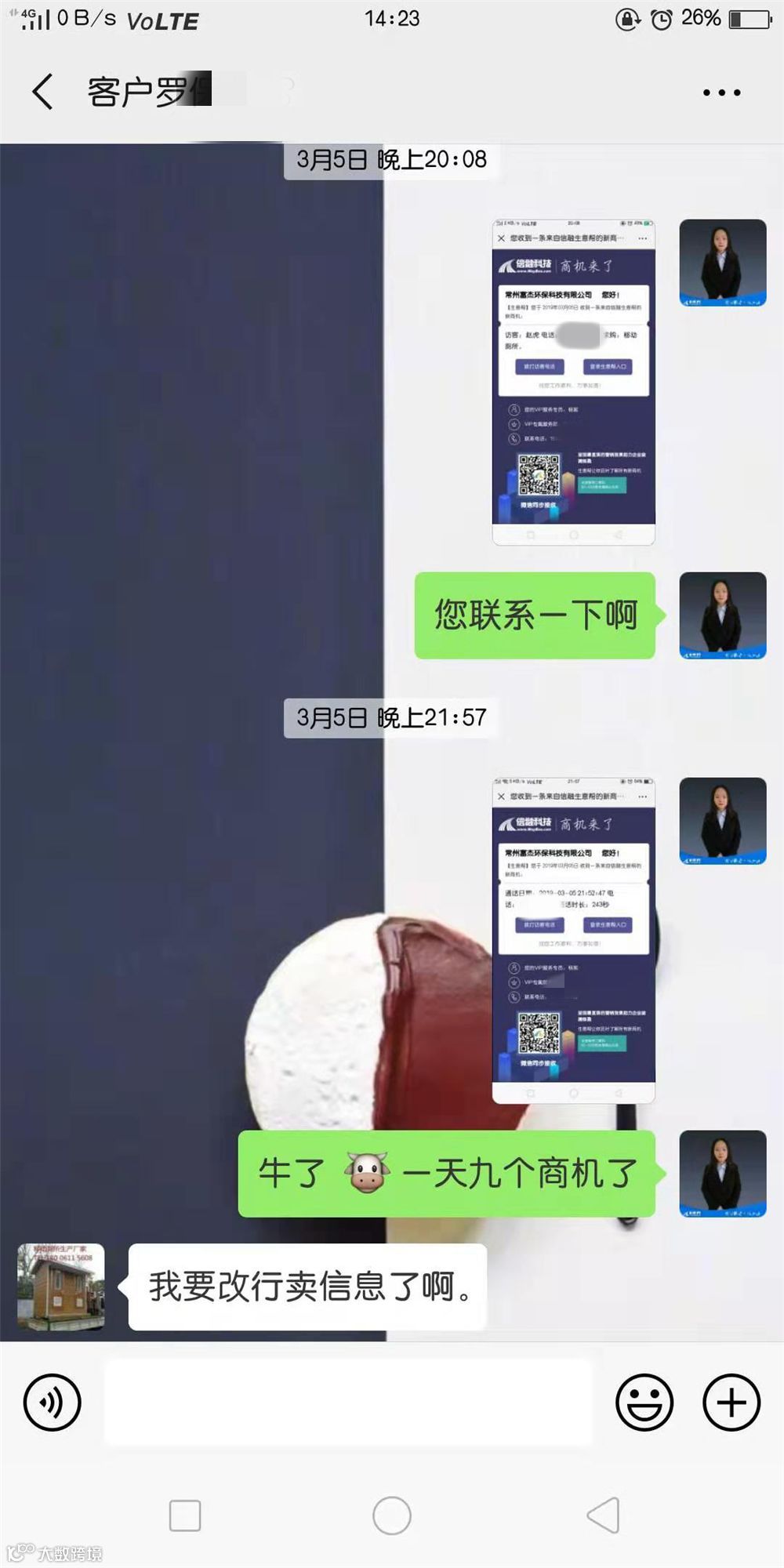 常州富杰环保科技有限公司,2019年3月5日,仅一日收到精准商机9条!富杰环保的罗总感慨道:“我要改行卖信息了啊!”