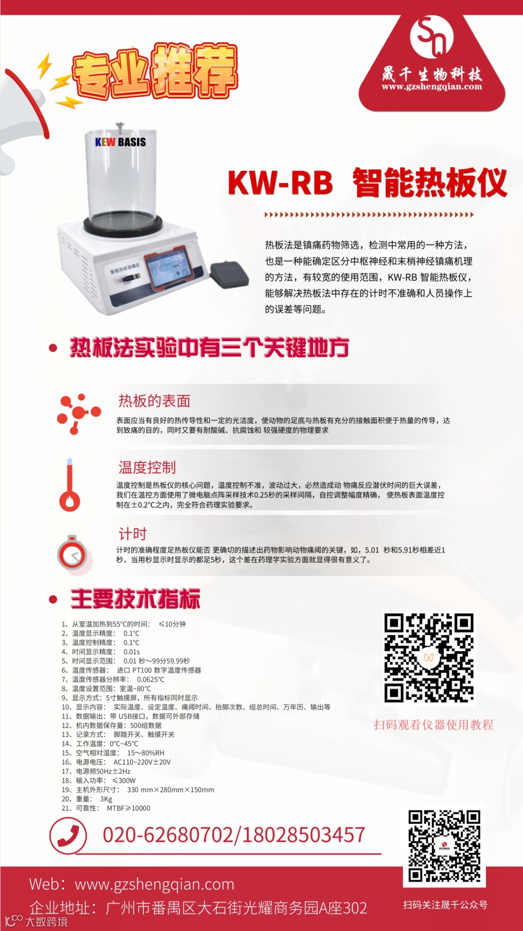 热板法是镇痛药物筛选,检测中常用的一种方法,也是一种能确定区分中枢神经和末梢神经镇痛机理的方法,有较宽的使用范围,过去由于在使用中温度控制不严格,计时不准确和人员操作上的误差,往往使实验作出的结果特异性不高,根据以上问题,KW-RB智能热板仪,解决了热板法中存在的问题,在试用和实用中受到了专家教授的一致好评。