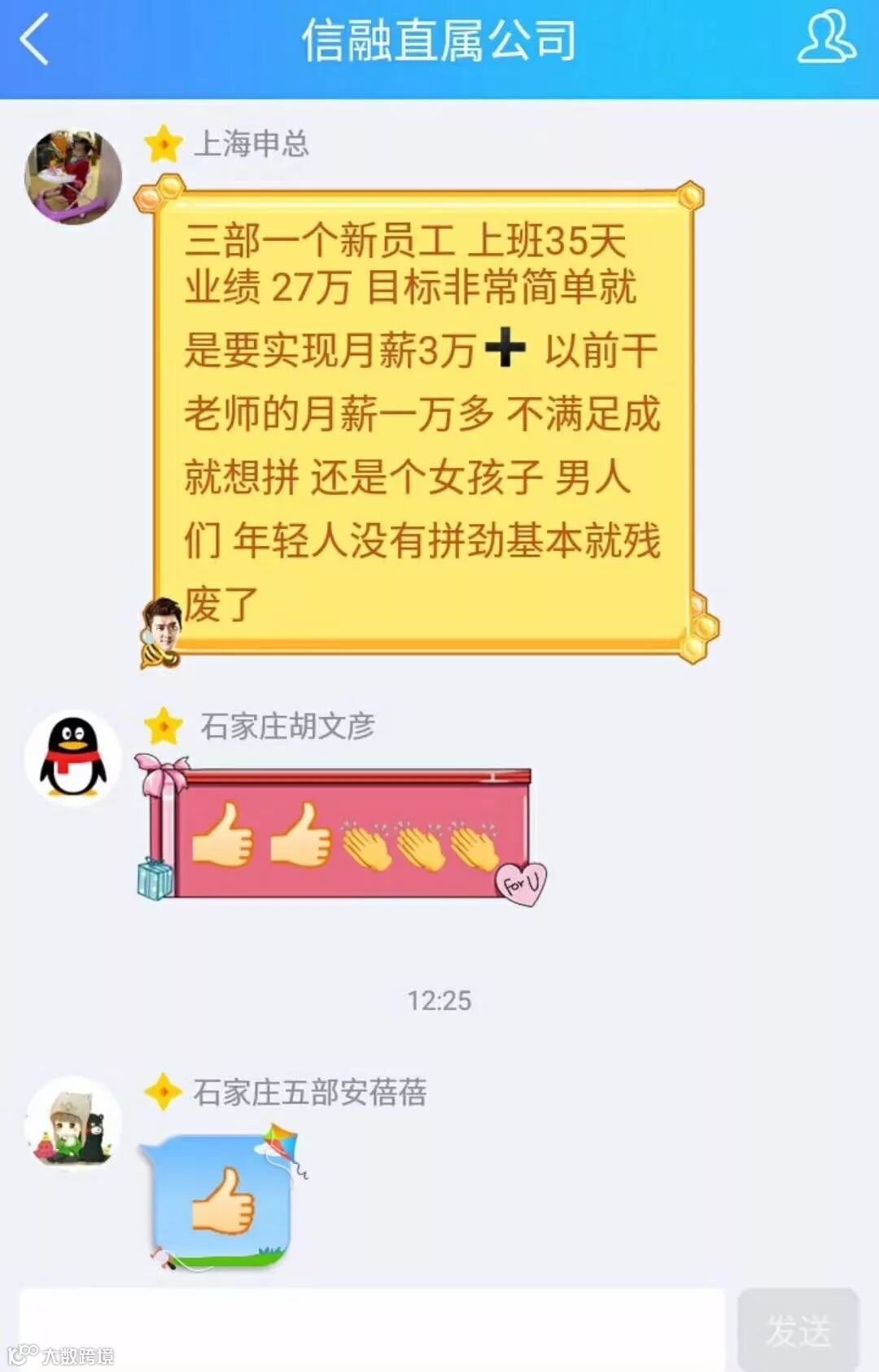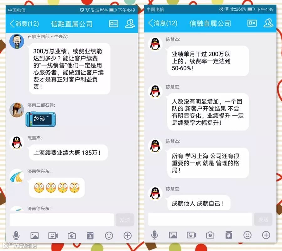 今天,随着13:01上海客户七部12800元的到账,上海公司12月业绩突破300万。“感谢总部 感谢上海所有管理层的拼搏又一次创造历史,单月突破300万!希望所有人持续超越目标实现自我价值!成就他人!感谢所有分公司的支持!”13:03,上海公司申总在集团管理群里发出了这段话,随后各个分公司老总表示要向上海学习,也都说出了上海公司创造奇迹背后的原因,道出了上海公司不断创造历史的精髓: