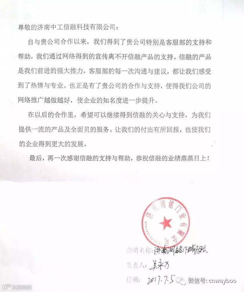 7.5日收到了润铭门业有限公司感谢信,在信中很感谢济南客服部的支持和帮助,客服的每一次沟通与建议都让客户充分的感受到了客服的专业性,认真负责的态度,上门服务。这个是新客户,刚上线,云商宝,制作过程中一直有跟客户沟通,后来客服过去和客户面对面的沟通解决问题,为后期的服务打好基础。