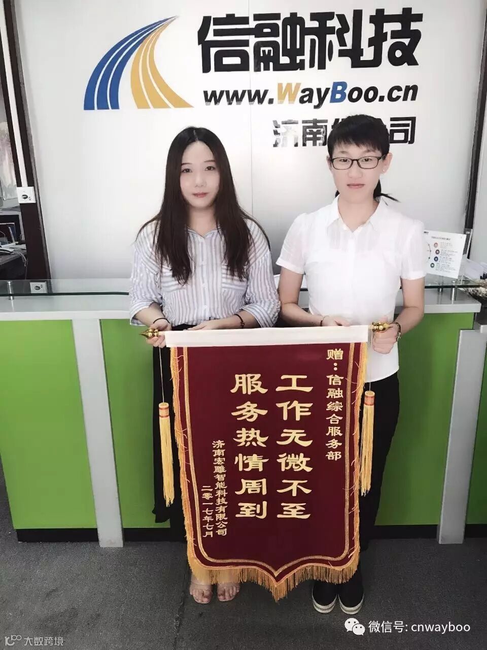 济南信融人无论是一线商务部还是延伸至后台客服人员都走在服务客户的前端,大家亲自上门为客户送去最真切的面对面服务。近日来,我公司也连续多次收到客户发来的感谢信与赞扬,充分肯定了我公司及时、准确、专业、专注的售后服务。2017年8月3号这天,信融集团(济南分公司)就收到济南宏雕智能科技有限公司送来的锦旗,高度赞扬了我公司客服部同事工作热情精准,服务优质高效的敬业精神,对我公司提供的优质高效的售后服务表示由衷的感谢