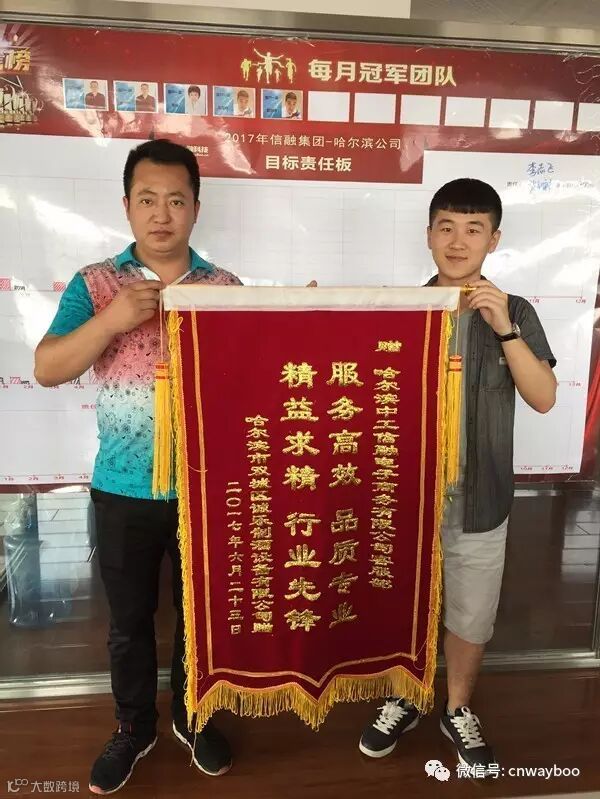 哈尔滨市双城区朝阳乡诚乐制酒设备经销处自2017年04月11正式合作直通车,合作两个月左右的时间哈尔滨信融就收到了锦旗,这两个多月与客服部都保持着很好的关系,一直对哈尔滨公司的客服部的工作很满意,每次有什么问题都很好的沟通解决,客服认真负责,真诚特别为客户着想,尤其是五月中旬,客户连续半个月,每天来公司跟客服商讨解决网站问题,也是这半个月的时间,让一个问题客户转变成忠诚客户,增加了我们与客户的粘度,增加客户对公司的满意度。所以赠送锦旗表扬感谢公司及客服部的工作。