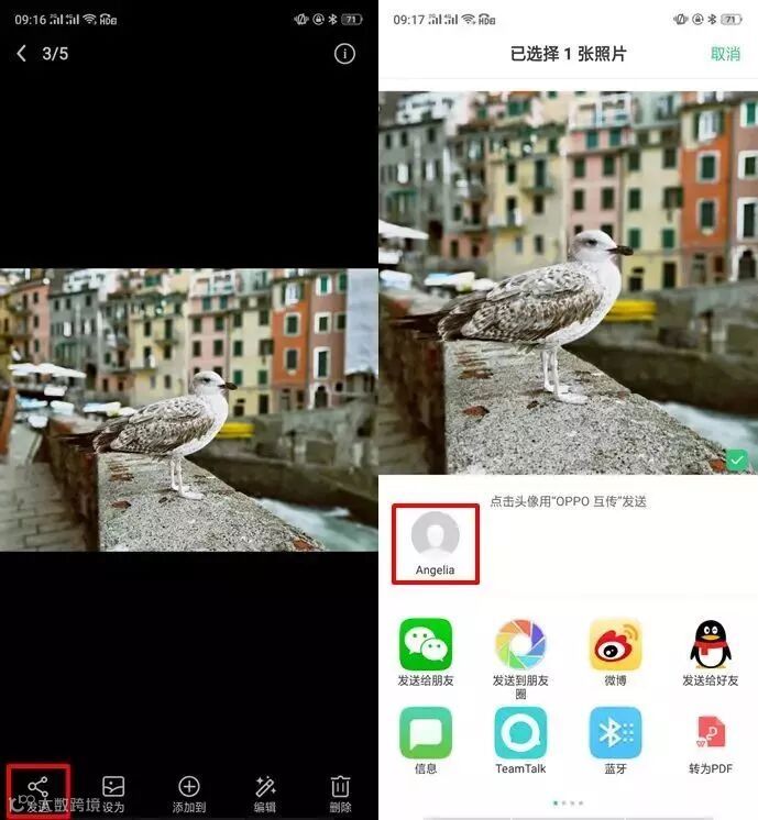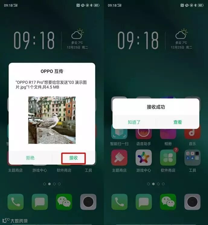 接收方另一部OPPO手机系统会自动检测到并显示在照片下方区域,点击接收即可接收成功。