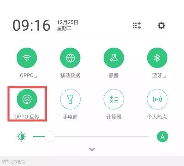 打开OPPO互传发送方和接收方下拉状态栏,双方均打开“OPPO互传”开关。