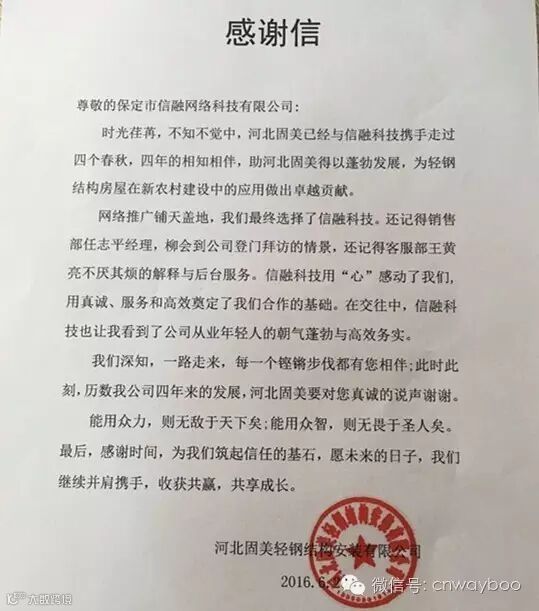 2016年6月20号,信融保定分公司客户三部的柳会收到一封来自河北固美轻钢结构安装有限公司(以下简称固美轻钢)的感谢信,信上特别提到在四年的合作中,信融保分的销售人员柳会和客服人员黄亮用最专业的知识和最热情的服务深深的感动了他们。信中动情的讲到信融科技用“心”感动了他们,用真诚、服务和高效奠定了合作的基础,感谢信最后展望未来指出两家企业必将并肩携手,收获共赢,共享成长。