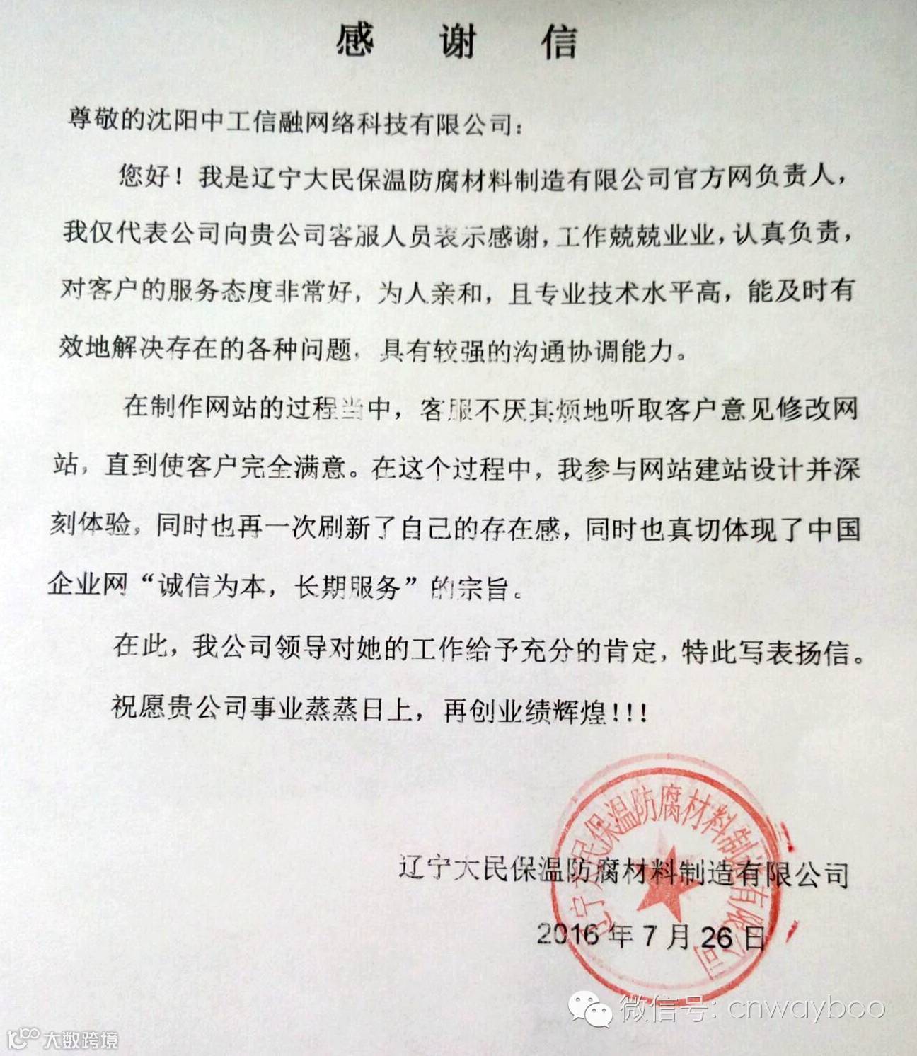本月26日是一个特殊的日子,因为在这一天信融沈阳分公司接到了第一封来自客户的感谢信,是由辽宁大民保温防腐材料制造有限公司的陈经理写给我们刚入职不到一个月的新客服郭迎楠的,虽然在沈分她属于新人,但是在这个行业也是属于一名身经百战的客服,之前在其他互联网公司从事客服工作,在入职后能快速熟悉工作流程进入工作状态,辽宁大民保温防腐材料制造有限公司是迎楠的第一个全程服务的客户,热情耐心的态度和敬业的精神得到了客户的高度认可,这也是为什么她能到客户感谢信的原因!