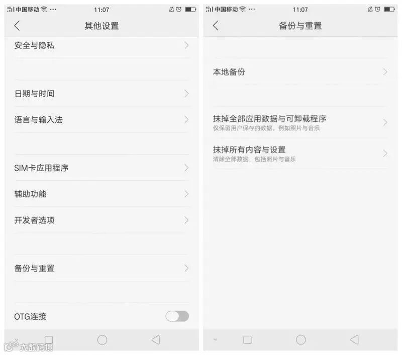 每款Android手机都有些不同,你可以在菜单中找到类似的选项;设置—其他设置—备份重置。Android还用还可以用一种更彻底的方法,就是让手机进入“恢复模式”,通常是同时按住音量减和电源键,然后就能进入恢复模式,选择“wipe data/factory reset”再等一会儿就能完成了。