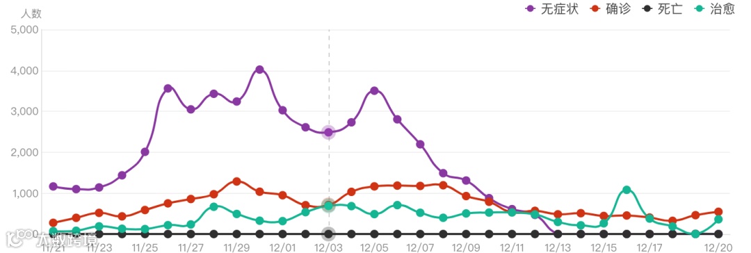 截至11月30日(放开前),新增+无症状重新创出新高,1023+4020=5043例,数据已破5000,且整体仍呈现上升趋势。虽然大面积居家办公后疫情的传播暂时稳定,但放开后数据再度飙升。
