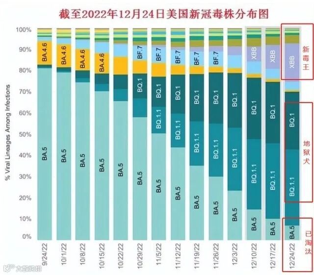 这一轮感染中国的主要是BF.7毒株和BA.5毒株,而这两种毒株其实在国外早就被淘汰了,美国那边的毒株至少领先中国两个大版本。而就在4周前,美国已经出现了最新的XBB毒株。其出现时的占比为2.7%,可仅仅只过了一个月,其阳性占比就暴增6倍已达18.3%,且还在持续增加中。医学专家们也预估未来2~3周XBB就会成为美国的主导型优势毒株。