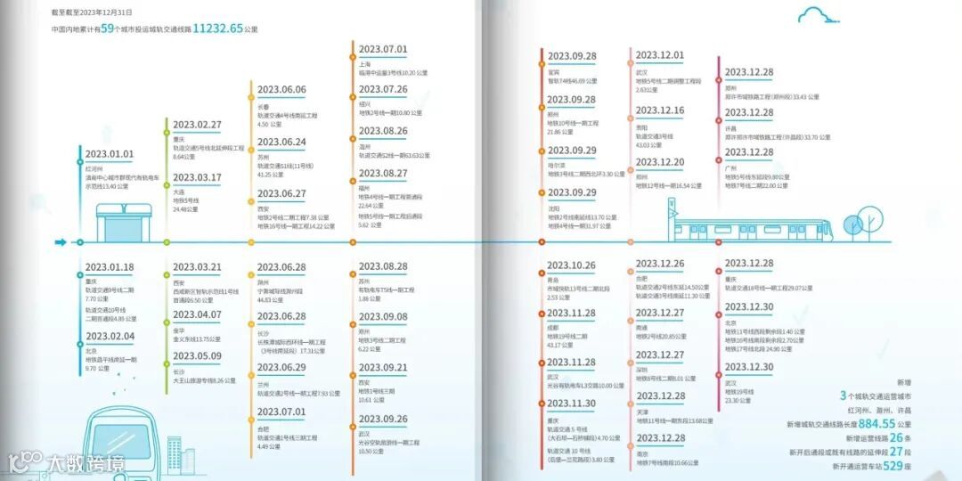 截至2023年 12月31日,中国内地累计有 59个城市投运城轨交通线路 11232.65公里。其中2023年新增城轨交通运营城市3个(红河州、滁州、许昌),新增城轨交通运营线路884.55公里。