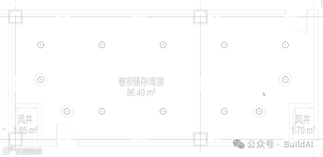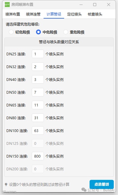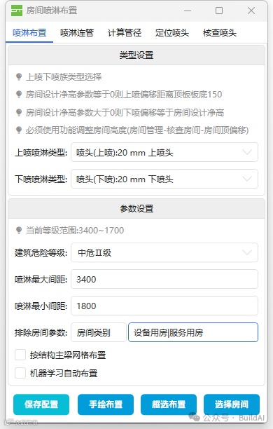 第一步:基于建筑房间功能和几何信息自动放置喷头。软件可以识别建筑模型中的房间名称,自动排除不布置喷淋的房间。基于项目危险等级设置和模型中的房间吊顶信息,自动在有吊顶的房间放置下喷喷头,在无吊顶的房间放置上喷喷头。