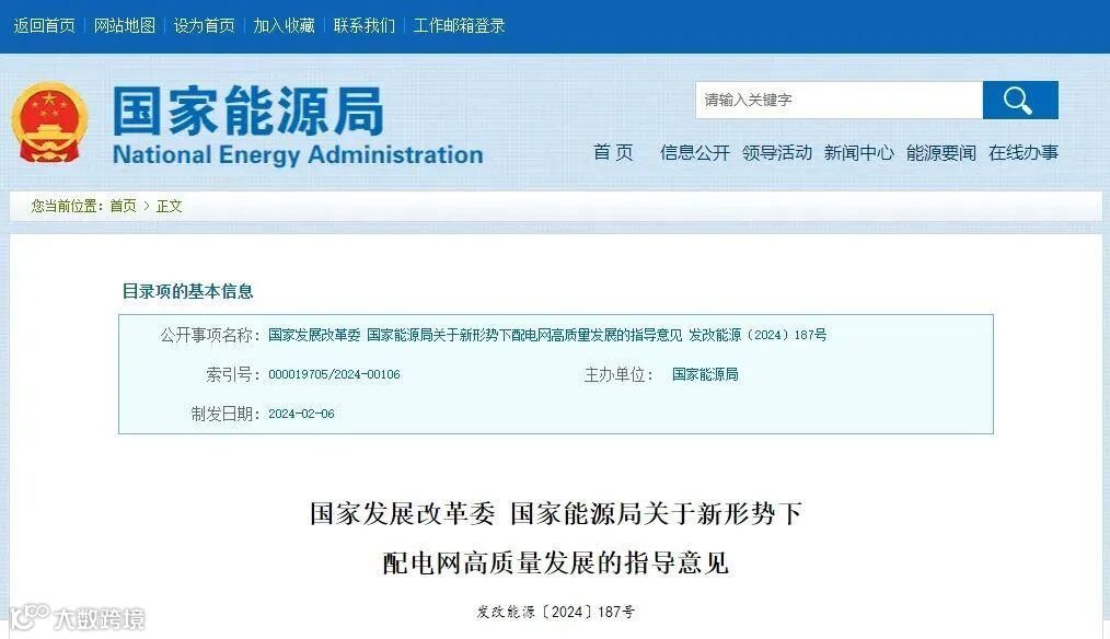 国家发展改革委、国家能源局于2月6日发布《关于新形势下配电网高质量发展的指导意见》。“到2025年,配电网网架结构更加坚强清晰,供配电能力合理充裕;配电网承载力和灵活性显著提升,具备5亿千瓦左右分布式新能源、1200万台左右充电桩接入能力;有源配电网与大电网兼容并蓄,配电网数字化转型全面推进,开放共享系统逐步形成,支撑多元创新发展;智慧调控运行体系加快升级,在具备条件地区推广车网协调互动和构网型新能源、构网型储能等新技术。”