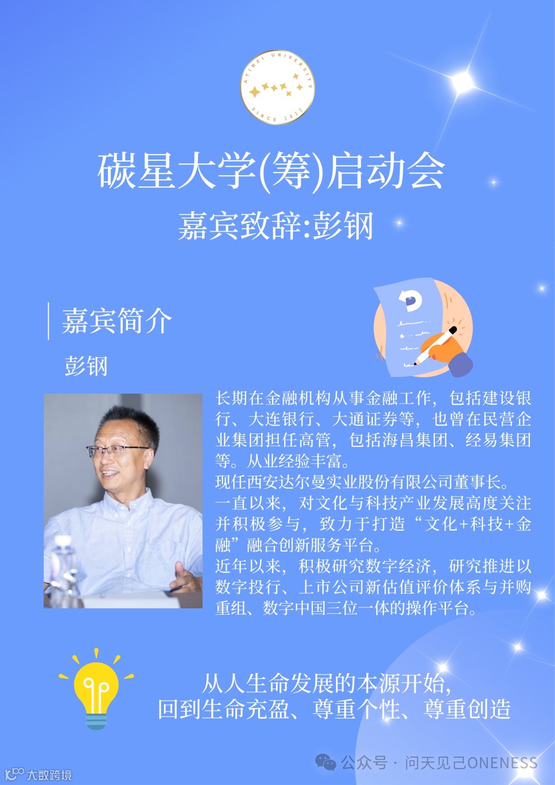 我是彭钢,一个孜孜不倦的生命实践者。在我作为金融从业者并遇到迷茫的时侯,因为生命意义的探索,认识到金融也只是一个表象,一个路径而已,从而逐步建立了生命实践者这个自我认知。在我长期从事金融业和文化旅游业的职业生涯中。因积极内观自我的生命驱动,亦不想落后于这个伟大的时代,所以一直关注未来世界社会发展的内在逻辑。