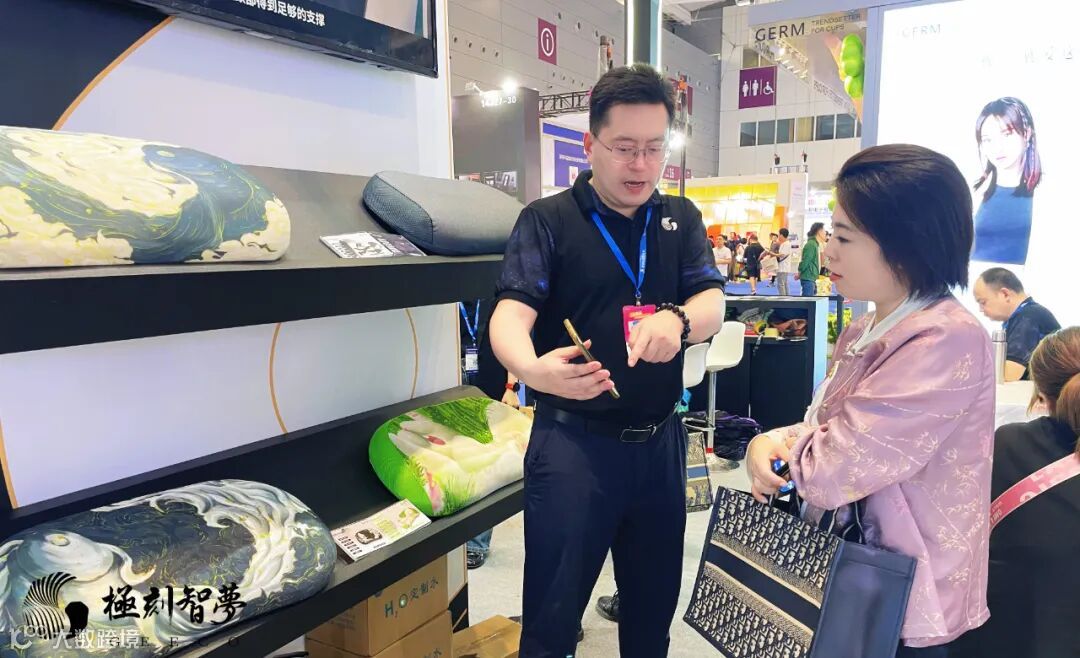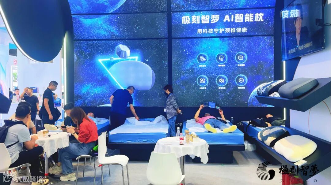 极刻智梦在展位中心展示了其最新研发的AI智能枕和软管护颈安睡枕。这些产品不仅外观时尚、设计人性化,更通过先进的科技为消费者带来了前所未有的睡眠体验。