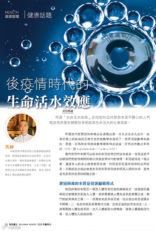 知悟收藏顾问、挠场资讯转录活水技术专家、生命活水养生专家、国家高级营养师、上海(中国)惪道聚生命活水实验室首席专家、中国食品工业协会饮用水专业委员会主任委员、首席活水专家马越先生在香港《紫荆杂志》上发表了《生命活水环:为往圣继绝学为万世开太平》一文,文中详细介绍了活水科技为人类带来的福音。同时,文中重点强调“信息活水技术的根本是中国道医的《金石活水疗法》,何志强教授是活化技术的指导顾问。