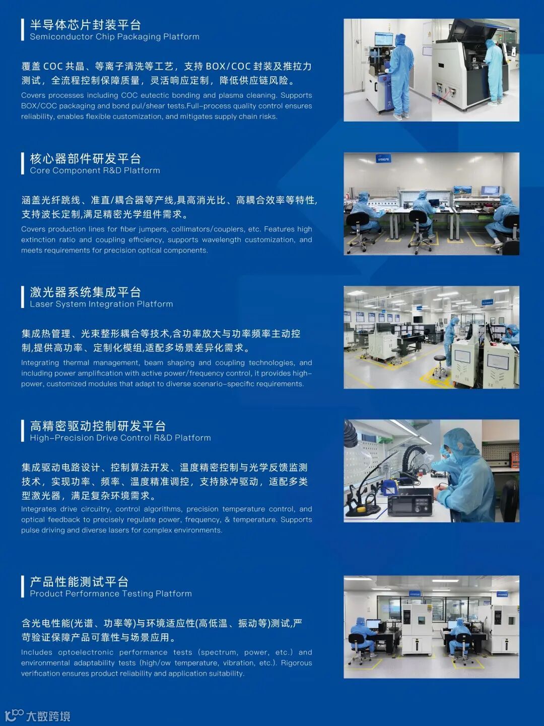 依托自主构建的五大技术平台—半导体芯片封装平台、核心器部件研发平台、激光器系统集成平台、高精密驱动控制研发平台及产品性能测试平台,公司实现了从芯片设计到系统集成的全链条技术闭环,确保产品在功率稳定性、波长精度及可靠性等核心指标上达到先进水平。