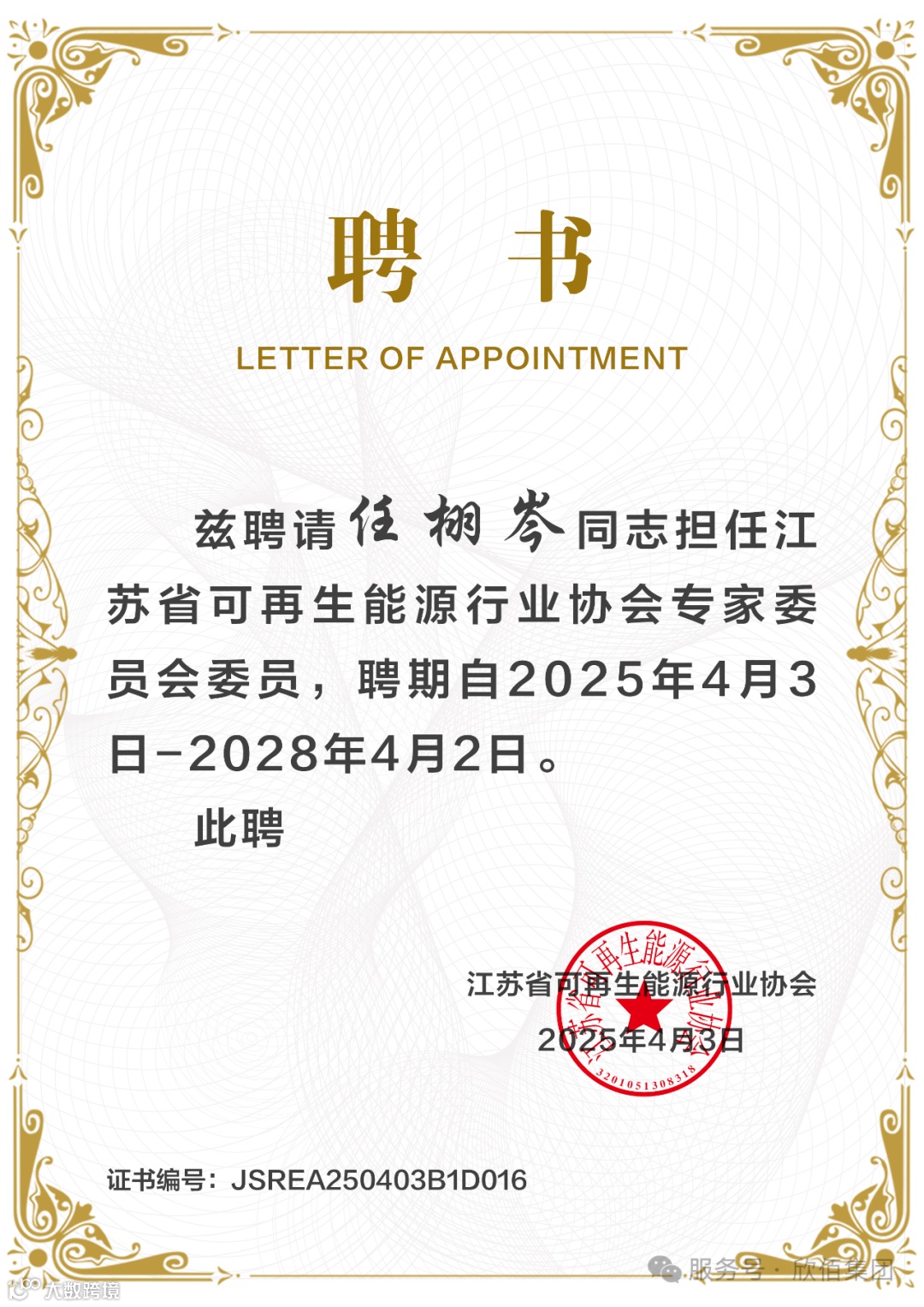 聘期自2025年4月3日起至2028年4月2日止,为期三年。这不仅是对任栩岑和张庆龙个人能力和集团整体研发能力的肯定,更是对欣佰集团在可再生能源领域持续创新和发展的高度认可!