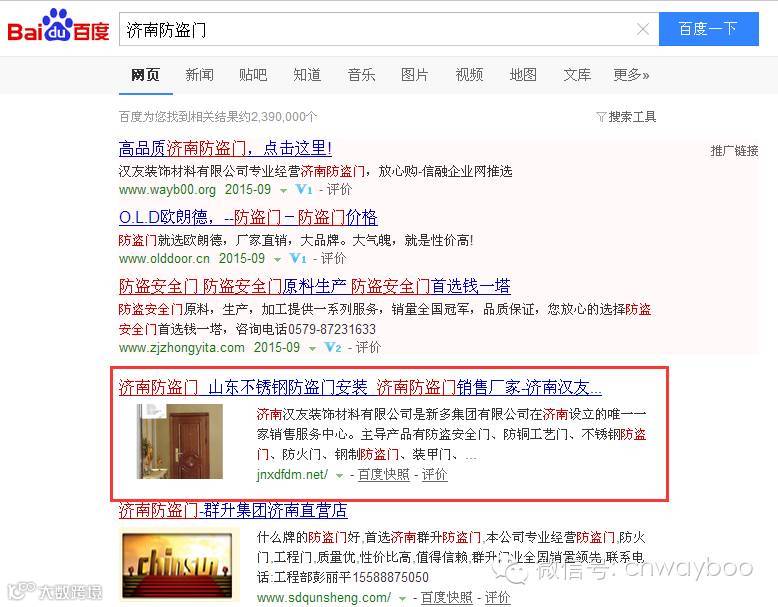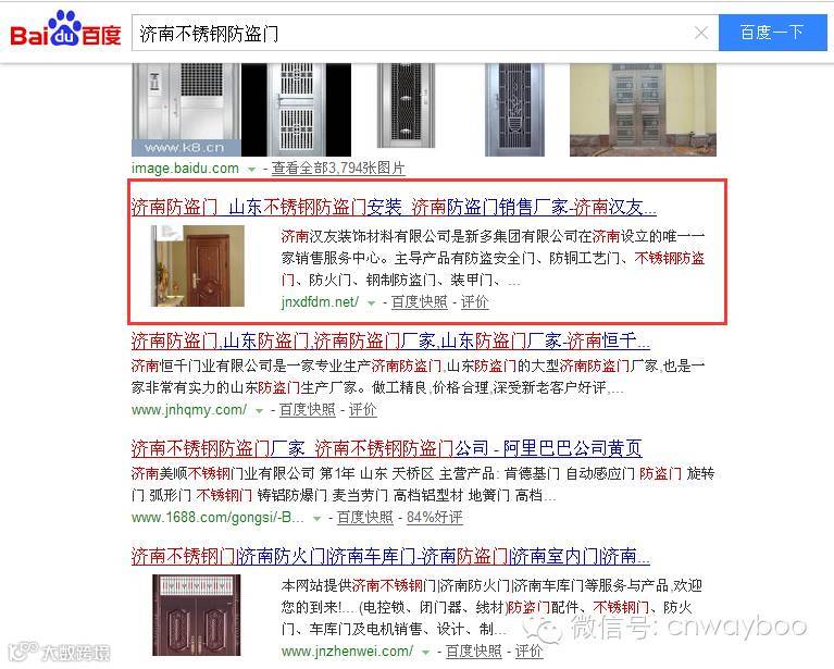 客户14年7月购买了公司的直通车产品,关键词为“济南防盗门”,我们在接到单子后,考虑到关键词本身涉及到地域,在设置关键词的时候title中设置了济南和山东,增加关键词的地域相关性,同时在建设外链的时候也着重加强了地域的优化,14年10月28号关键词优化到首页,之后我们又开始着手优化相关产品词,到目前为止该客户的百度关键词已达到100+,到目前为止,主关键词“济南防盗门”稳定的排在首页第一位将近1年的时间,客户很认同我们的产品,于今年的8月10号续费。