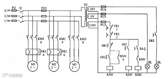 针对上述现象,对车床发生的电气故障进行分析,机床照明灯和指示灯均可正常工作,按下接触器衔铁后,电动机可以正常运行,说明主电路没有问题,就初步判断是控制电路发生了问题。下面采用电压分段测量法查找电气故障,将万用表调到电压档,去测量控制电路电源两端电压,经过万用表测量电压值正常,说明控制电路的电源没有问题,然后再用万用表去测量热继电器FR1常闭触点两端的电压,正常情况下FR1常闭触点两端电压为0,但是用万用表测量FR1常闭触点两端电压为110V左右,接着在测量热继电器FR2常闭触点两端的电压为0,然后再测量按钮SB1两端电压、按下按钮SB2后测量其两端电压、按下按钮SB2后测量KM1线圈电压两端均为0,再用这种方法去测量KM2线圈回路、KM3线圈回路,测量结果表明只有FR1常闭触点两端有电压,其余测量结果均为0。通过发现配电箱内接线良好,FR1触点接线并未出现虚接、压绝缘皮等现象。通过上述测量结果可以判断出FR1常闭触点动作变成常开触点,为什么热继电器触点会动作呢,是因为电动机发生了过载,过载电流流过热继电器热元件,热元件经过能量积累后,热元件弯曲推动推杆使其触点动作。