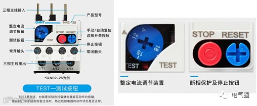 下面以正泰公司生产的NR2-25热继电器为例介绍热继电器。热继电器上端三相主线接入与接触器下端口连接,热继电器三相主线出线去接三相电动机。热继电器有一对常开触点和一对常闭触点,常开触点一般接入到控制电路中,当电动机发生过载后,常闭触点断开,从而切断电源,电动机停止工作;常开触点一般去接报警设备,比如报警指示灯、蜂鸣器等。热继电器的动作电流值可以通过调节整定电流调节按钮,一般热继电器的动作电流值取电动机额定电流的0.95~1.05倍。如果选择热继电器整定电流值偏小,电动机不能正常工作;如果选择热继电器整定电流偏大,电动机发生过载时也不能及时切断电源,有可能造成损坏电动机的后果。通过按下测试按钮就可以模拟过载后热继电器动作,其常闭触点断开,常开触点闭合。当热继电器动作后,其触点如何复位,这种热继电器有两种复位方式,一种是自动复位,一种是手动复位,在热继电器上蓝色按钮就是复位按钮,这个复位按钮上面写了两个字母,一个是A,一个是H,A表示自动复位,用十字螺丝刀旋转复位按钮,将A旋转到上面,此时复位按钮被按下,此时处于自动复位状态,即热继电器发生过载后,经过一段时间后,热继电器的触点自动进行复位。用十字螺丝刀将旋转复位按钮,将H旋转到上方此时热继电器处于手动复位状态,即热继电器发生过载后,只有手动按下复位按钮后,热继电器的触点才能进行复位。按下红色停止按钮后,热继电器的常闭触点断开,而热继电器的常开触点不动作,松开红色停止按钮后,常闭触点复位。