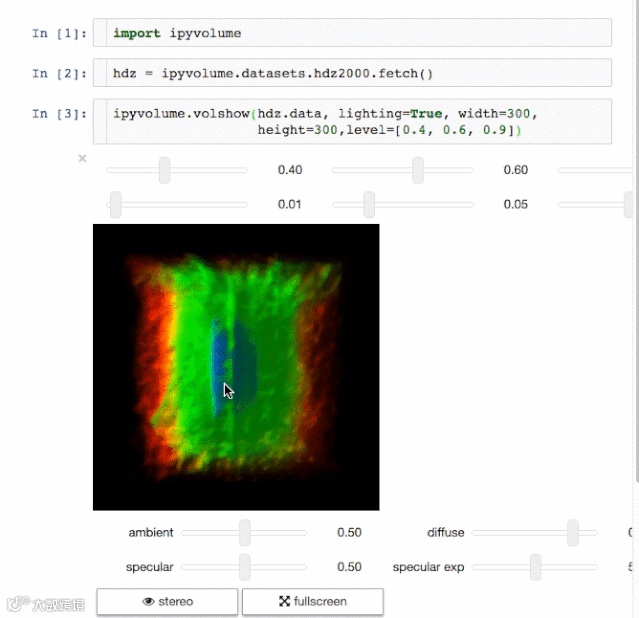 结果展示也是数据科学中的一个重要方面。能够将结果进行可视化将具有很大优势。IPyvolume 是一个可以在 Jupyter notebook 中可视化三维体和图形(例如三维散点图等)的 Python 库,并且只需要少量配置。但它目前还是 1.0 之前的版本阶段。用一个比较恰当的比喻来解释就是:IPyvolume 的 volshow 对于三维数组就像 matplotlib 的 imshow 对于二维数组一样好用。可以在这里获取更多。