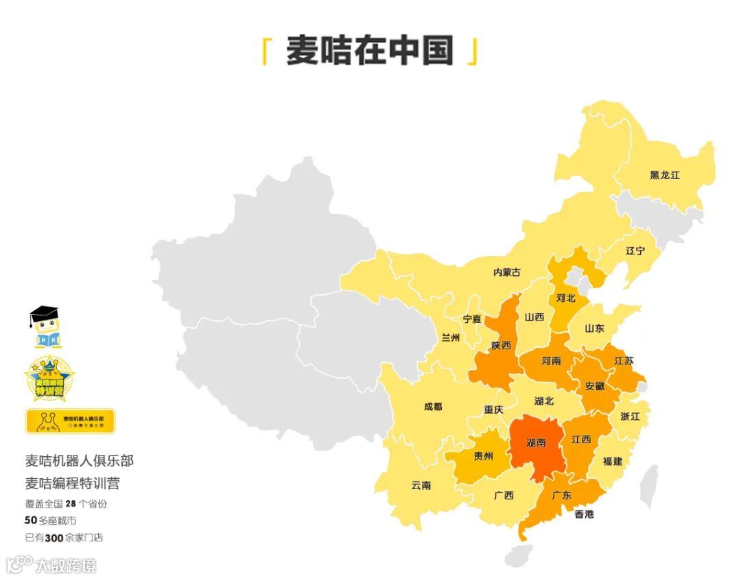 麦咭编程&机器人教育目前线下覆盖全国28个省份,50多个城市,已有300余家校区。