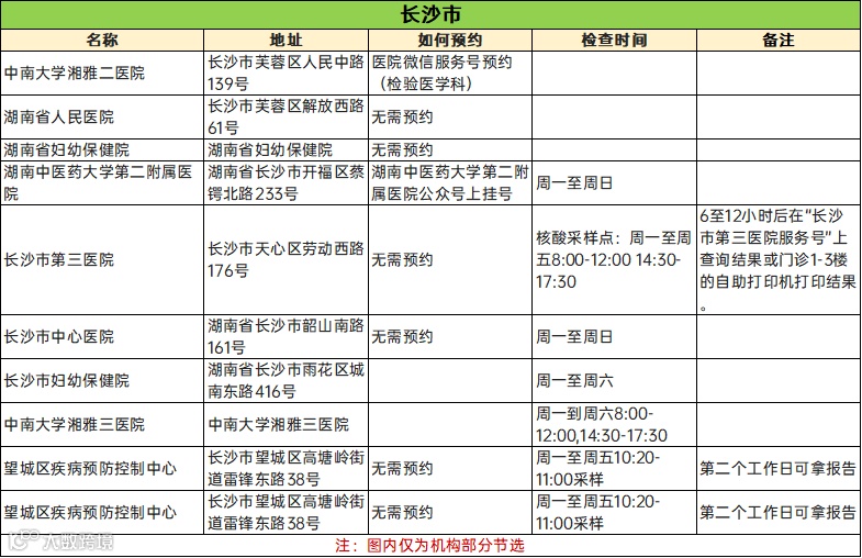 ● 图片仅为部分机构节选,完整机构详情,可以进入公众号【长沙本地宝】,后台对话框回复:核酸,获取信息