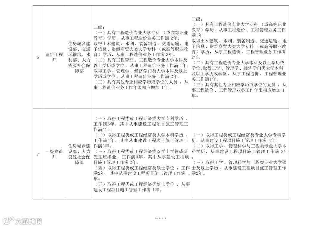 取得土木建筑、水利、装备制造、交通运输、电子信息、财经商贸大类大学专科(或高等职业教育)学历,从事工程造价业务工作满6年。