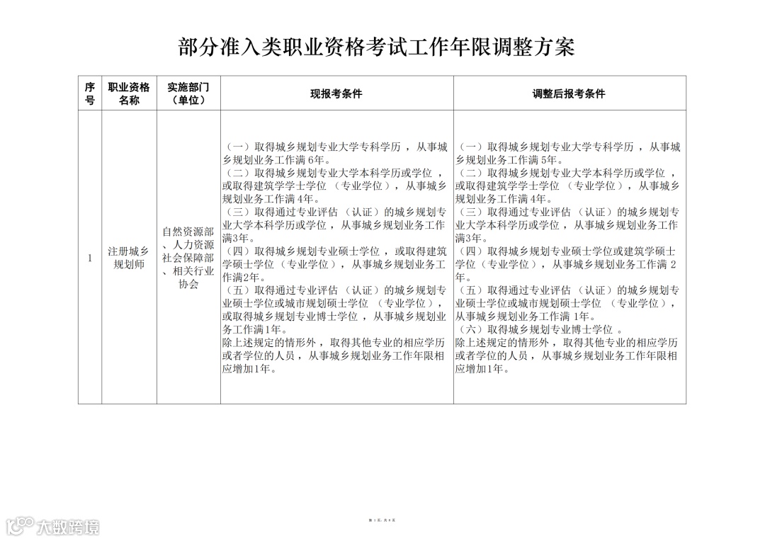 关于部分准入类职业资格考试工作年限调整方案公示为贯彻落实《政府工作报告》要求,推动降低就业门槛,我部会同国务院有关部门研究制定了部分准入类职业资格考试工作年限调整方案。现予以公示,公示期7天。如有意见建议,请于2021年12月9日之前通过电话、电子邮件等形式反馈人力资源社会保障部专业技术人员管理司。