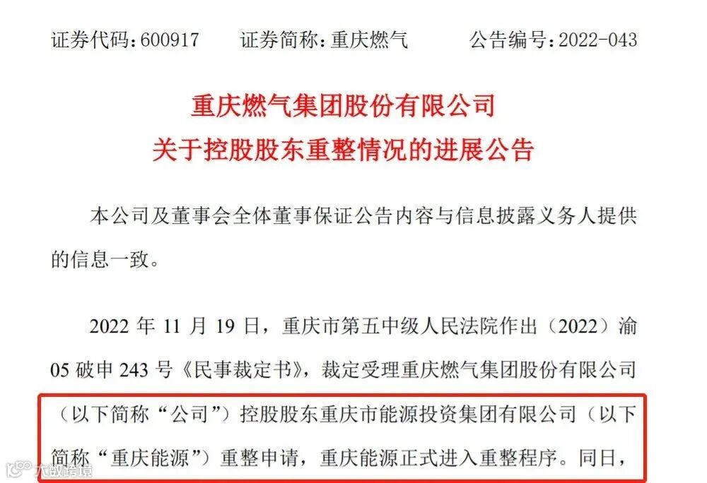 11月23日,重庆燃气(SH:600917)发布公告称,公司控股股东重庆市能源投资集团有限公司(下称重庆能源),于2022年11月19日收到法院裁定书,法院裁定受理重庆能源的重整申请,重庆能源正式进入重整程序。