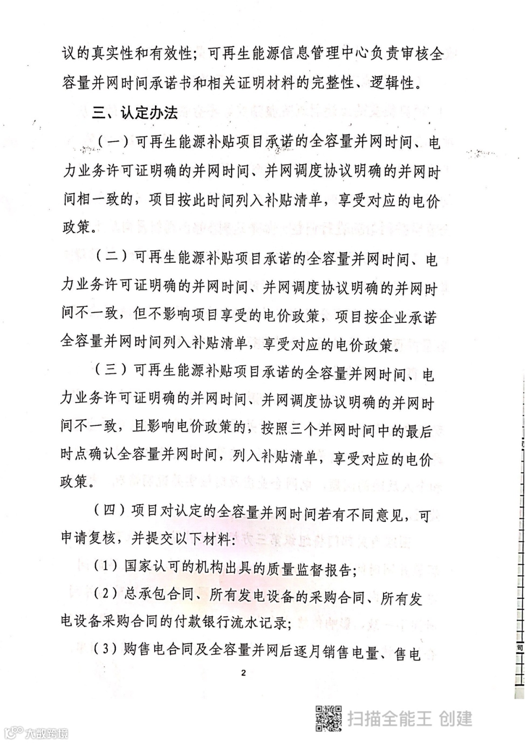 地方能监部门与电网公司无法认定的,暂按上述《办法》进行认定。根据该办法,可再生能源补贴项目申请补贴清单时,应提交全容量并网时间承诺,并提交相关核验资料.承诺内容包括:全容量建成完工的并网时间,办理电力业务许可证时是否完成全容量并网,办理并网调度协议时是否完成全容量并网,同时提交承诺书、电力业务许可证以及并网调度协议等资料。