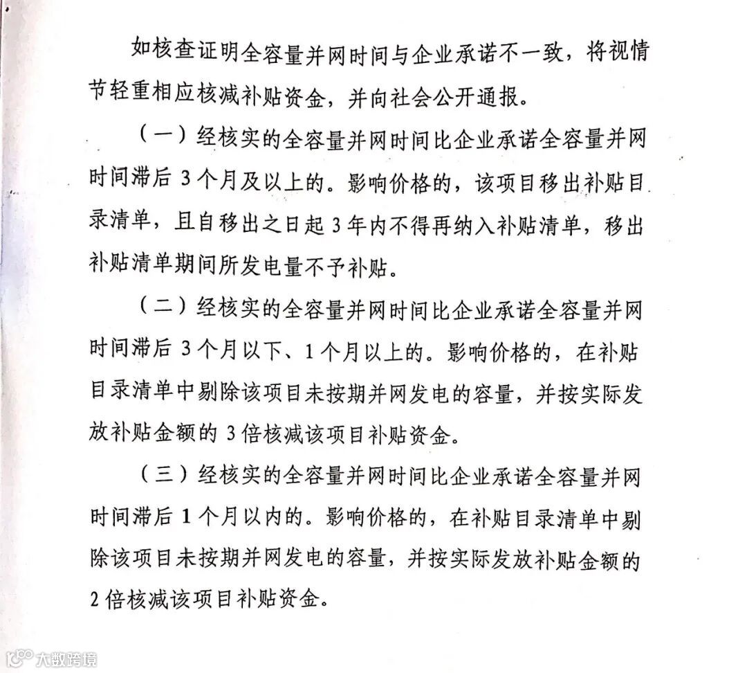 不过,为了确保全容量并网的真实性,文件也明确要求,提交资料明确、不存在时间矛盾的项目,也需要计算并网后12个月的年均平均利用小时数,以50%为界限,达到这一比例的才可按承诺时间列入补贴名单。如果核查不一致将视情节轻重进行处罚,影响价格的,最严重的将在补贴目录中剔除该项目未按期并网发电的容量,并按实际发放补贴金额的3倍核减该项目补贴。