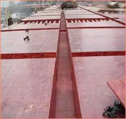 楼板模板:模板支撑体系经过严格验算,并履行审批手续,确保支撑体系的刚度、强度及稳定性。严格控制模板起拱高度,跨度大于或等于4m的梁板按2/1000起拱。跨度8.4m楼板按1.5cm起拱。