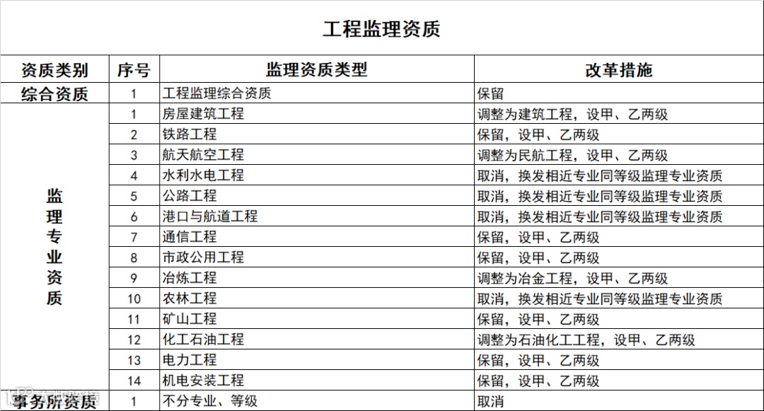 监理专业资质等级压减为甲、乙两级,原丙级资质并入相应专业的乙级资质。取消事务所资质。