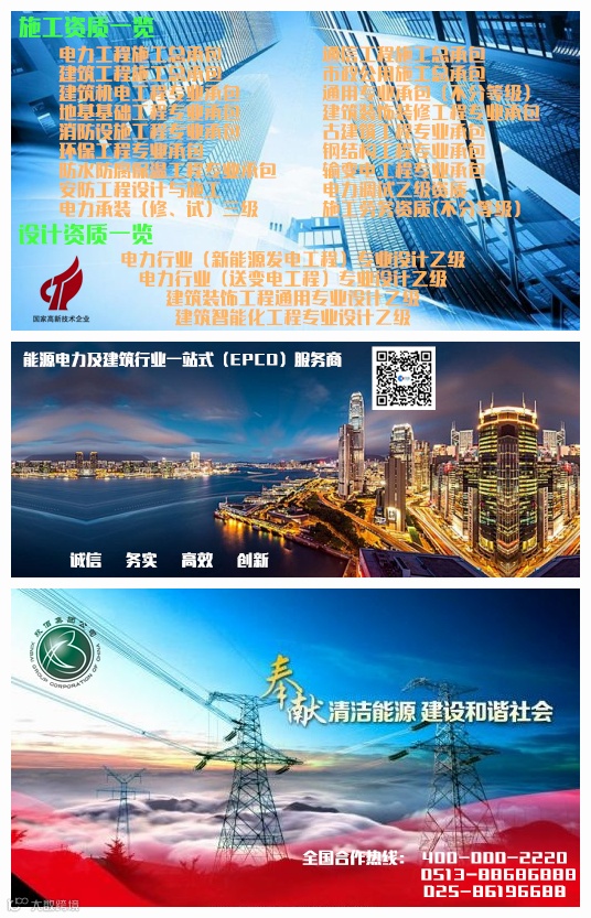 本公司专业从事并具备以下资质:建筑工程,电力工程,市政公用工程,通信工程总承包及建筑智能化、装饰装修、幕墙工程、消防设施工程、钢结构工程专业设计与施工,工程咨询,能源合同管理,新能源技术开发、设计及施工,项目管理及电子、电气成套设备销售、研发等,电力行业(送变电工程),新能源工程,环保工程,建筑智能化工程,建筑装饰装修工程咨询、设计、施工等。