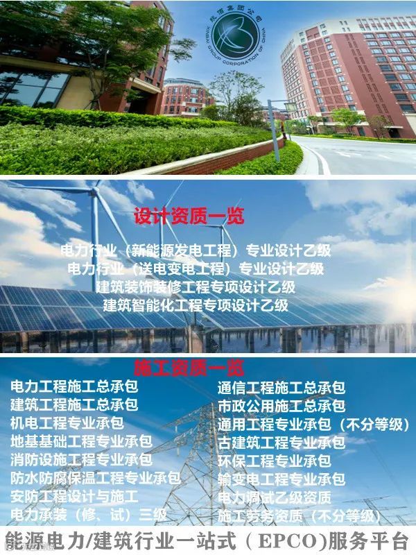 本公司专业从事并具备以下资质:建筑工程,电力工程,市政公用工程,通信工程总承包及建筑智能化、装饰装修、幕墙工程、消防设施工程、钢结构工程专业设计与施工,工程咨询,能源合同管理,新能源技术开发、设计及施工,项目管理及电子、电气成套设备销售、研发等,电力行业(送变电工程),新能源工程,环保工程,建筑智能化工程,建筑装饰装修工程咨询、设计、施工等。