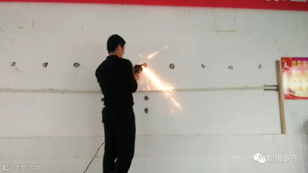 墙壁后方穿墙螺丝多余部分打磨切除、小伙伴很辛苦