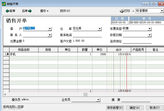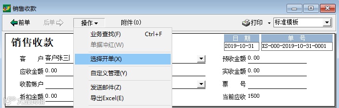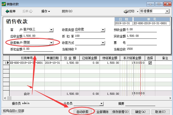 如图开单后,形成客户欠款1500元。当我们收到这1500元的时候,进入销售收款处理。