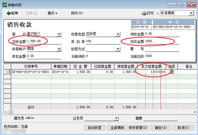 三、销售开单后,部分结算的情况(如情况2的例子,销售开单金额是1500元,但是本次客户付款1000元,余下500元下次再付)