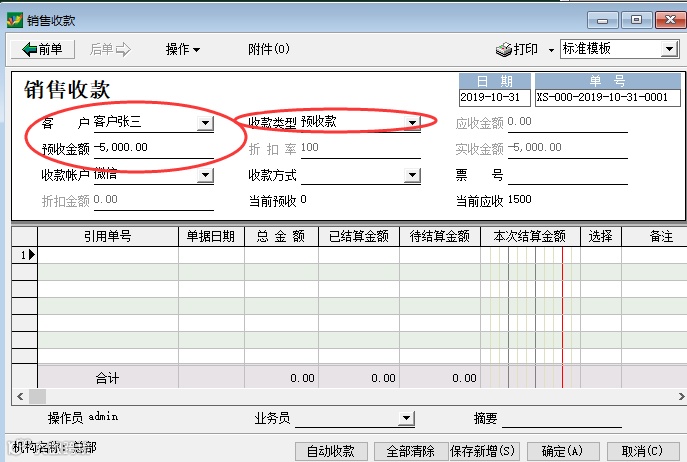 如案例中客户销售开单1500元,之前有预收58000元的情况。本次使用预收款冲抵1500元货款的操作如下图: