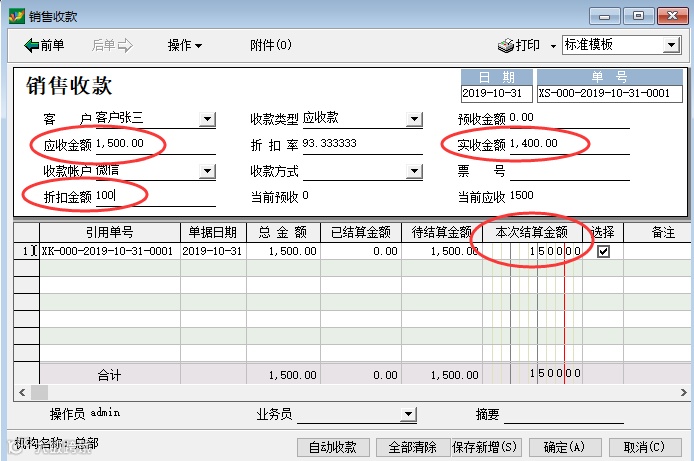 如上图1234,点开销售收款——选择客户——选择收款类型(应收款)——点击操作——选择开单——设置终止日期(单据所在期间)——勾选对应的结算单据——确定——输入表格里的本次结算金额(1500)——输入表头的应收金额(1500)——输入实收金额(1400)——输入折扣金额100——选择收款账户——确定