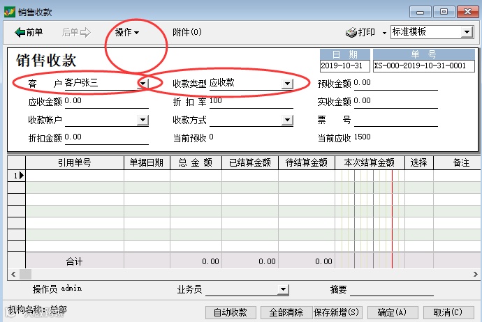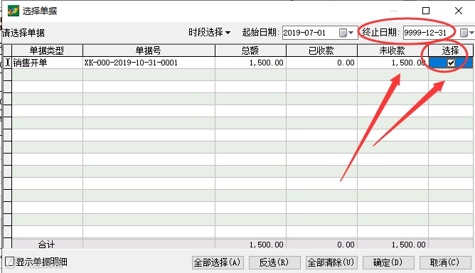 如上图1234,点开销售收款——选择客户——选择收款类型(预收冲应收)——点击操作——选择开单——设置终止日期(单据所在期间)——勾选对应的结算单据——确定——输入表格里的本次结算金额(1500)——输入表头的应收金额(1500)——确定